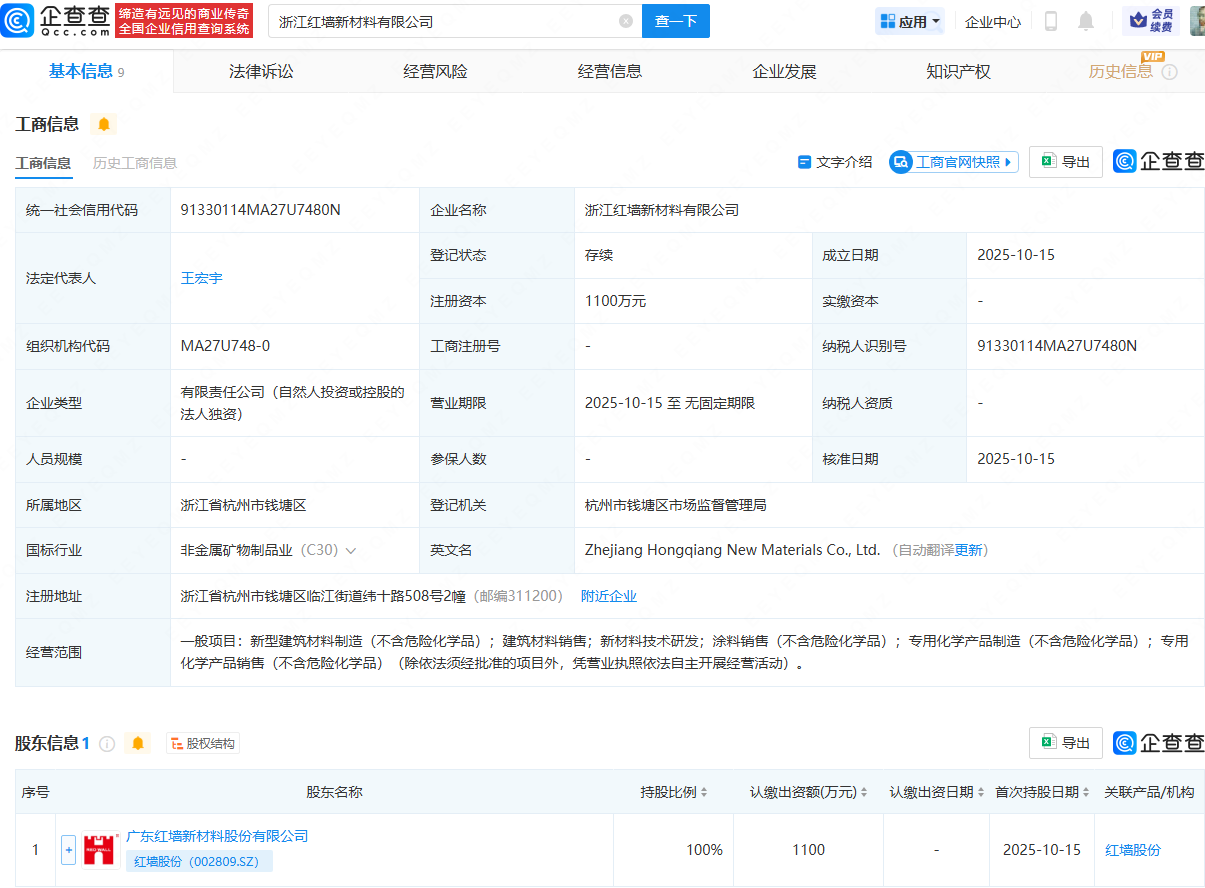 近日口袋超盘,浙江红墙新材料有限公司成立,法定代表人为王宏宇,注册资本为1100万元,经营范围包含:新型建筑材料制造(不含危险化学品);建筑材料销售;新材料技术研发;涂料销售(不含危险化学品)等。企查查股权穿透显示,该公司由红墙股份(002809)全资持股。